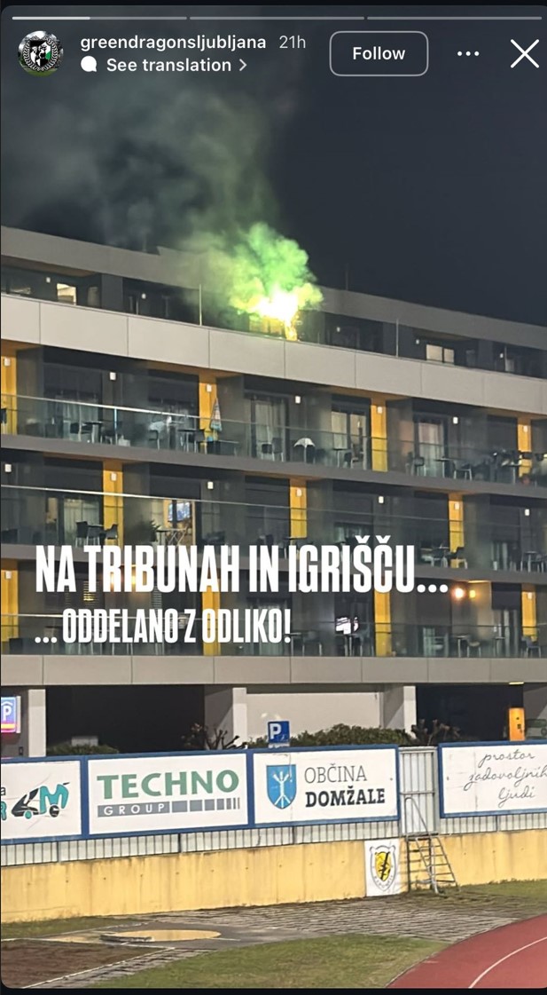 V Medgeneracijskem centru Bistrica smo zgroženi nad nedavnim incidentom, ki se je zgodil na naši lokaciji. Dne 15.3.2025 (med tekmo NK Radomlje in NK Olimpija) je posameznik, pripadnik navijaške skupine Green Dragons, preplezal varovalno ograjo in na strehi našega centra prižgal navijaško baklo. S tem je neposredno ogrozil varnost naših stanovalcev, zaposlenih ter sebe, kar je za nas povsem nesprejemljivo in obsojanja vredno dejanje.